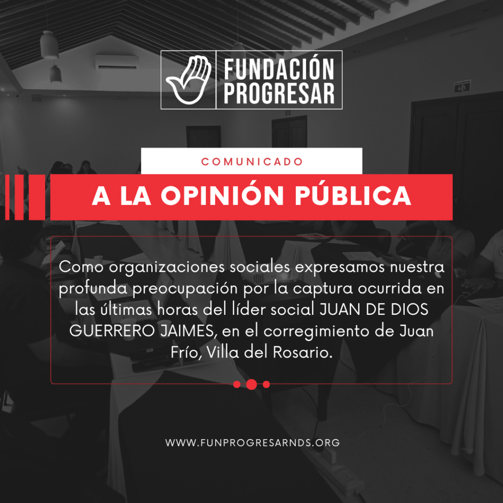 Las organizaciones firmantes expresamos nuestra profunda preocupación por la captura, ocurrida en las últimas horas, del líder social JUAN DE